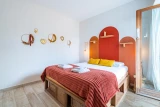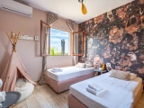 Drei Schlafzimmer teilen sich ein geräumiges Gemeinschaftsbad mit Badewanne und Doppelwaschbecken, das ganz auf den Komfort von Familien ausgelegt ist. Es gibt ein Kinderzimmer mit zwei Einzelbetten, das perfekt für die Kleinsten geeignet ist, sowie zwei gemütliche Schlafzimmer mit jeweils einem 160 cm breiten Doppelbett, die einen komfortablen und einladenden Rückzugsort bieten.